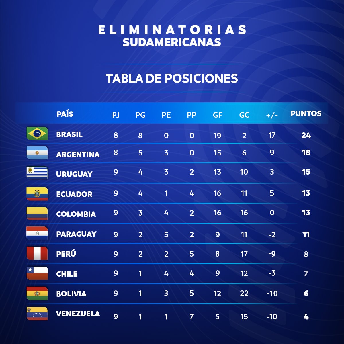El Blanquirrojo Eliminatorias Qatar 2022 Tabla De Posiciones Te Dejamos La Tabla De Posiciones Tras Finalizar La Fecha 9 De Las Eliminatorias Sudamericanas De Cara